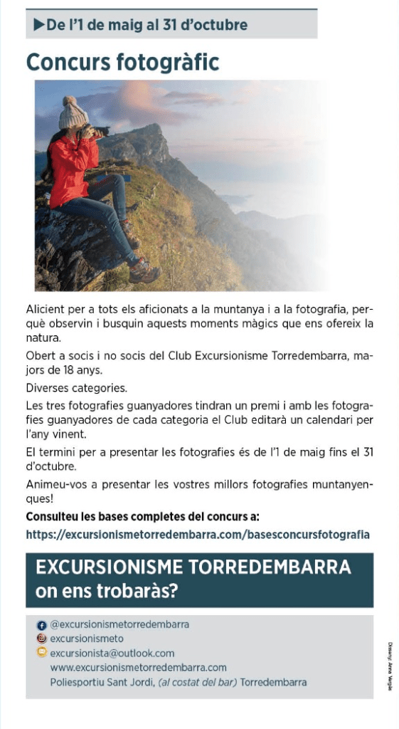 1 agosto, 20128 mayo, 2022 Excursionisme Torredembarra (01-05-22 al 31-10-2022) Concurs fotogàfic AQUI podreu trobar l’enllaç directe a les bases del concurs: https://excursionismetorredembarra.com/basesconcursfotografia Comparte esto: Haz clic para compartir en X (Se abre en una ventana nueva) X Haz clic para compartir en Facebook (Se abre en una ventana nueva) Facebook Me gusta Cargando...