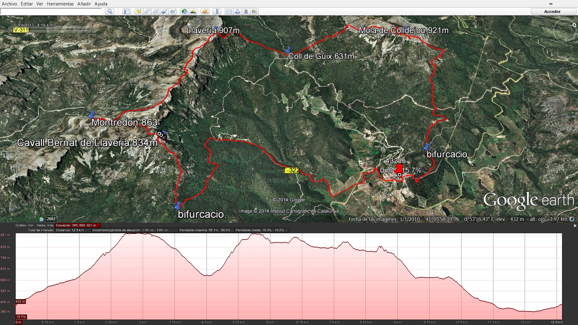 Sortirem d’hora per no agafar molta calor, iniciem el recorregut a Colldejou, pujarem cap a la Mola per la Canal del Ballet, farem cim i baixarem cap al coll del guix, continuarem per la forta pujada a la miranda, Mont-redon i finalment El cavall Bernat, després ja tornarem cap a colldejou.