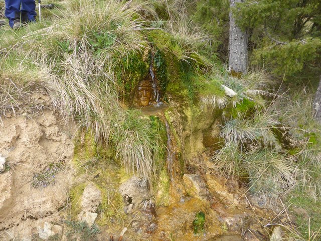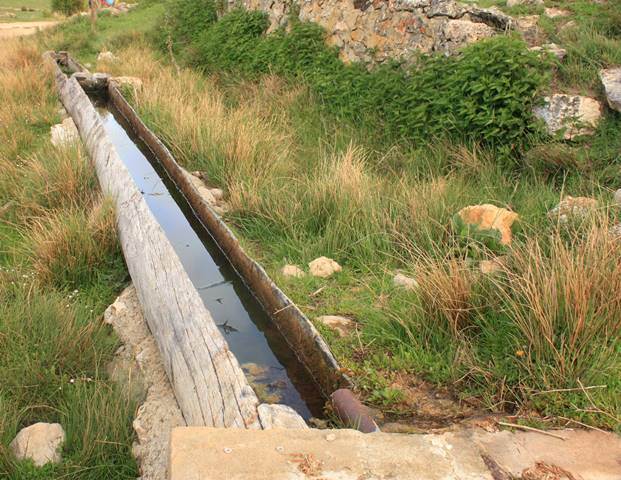 En aquest trencall veurem una font on l’aigua pasa per un abeurador per a bestiar fet amb un tronc de pi, tal com ens varen explicar ahir al museu de la transhumància aquest fonts tenen molt anys i mentres tinguin aigua la fusta es conserva intacta, i realment així és.