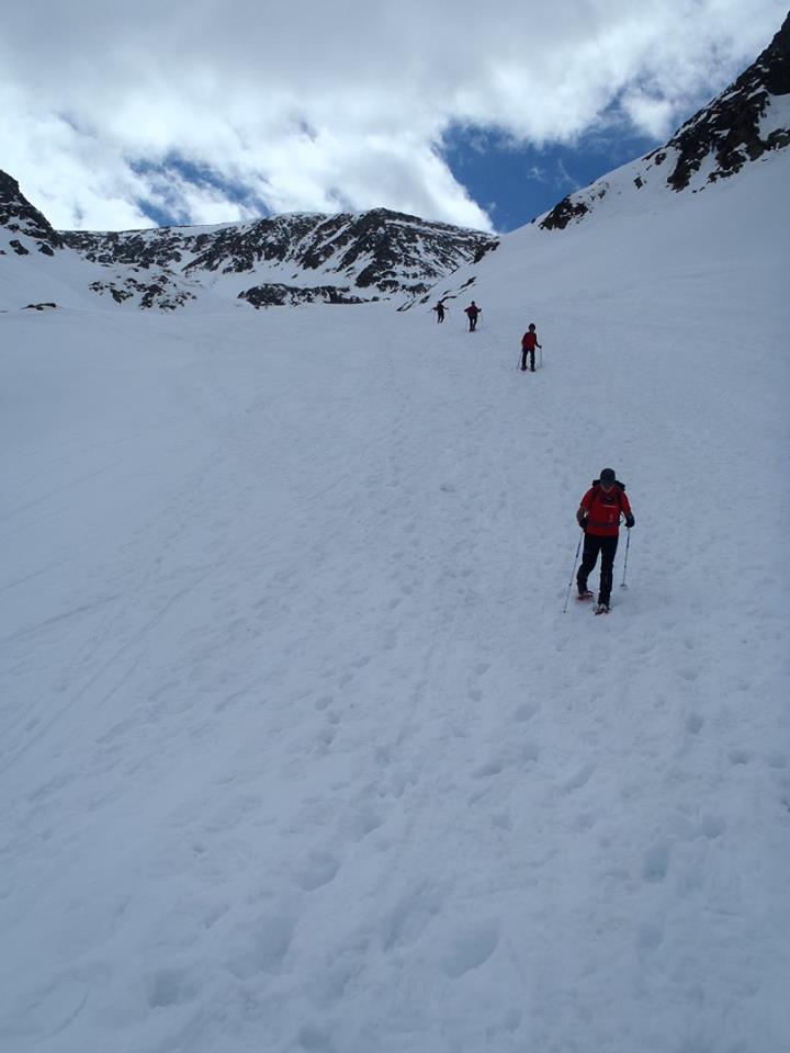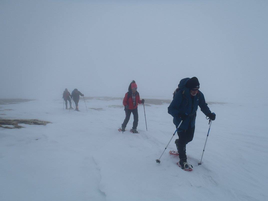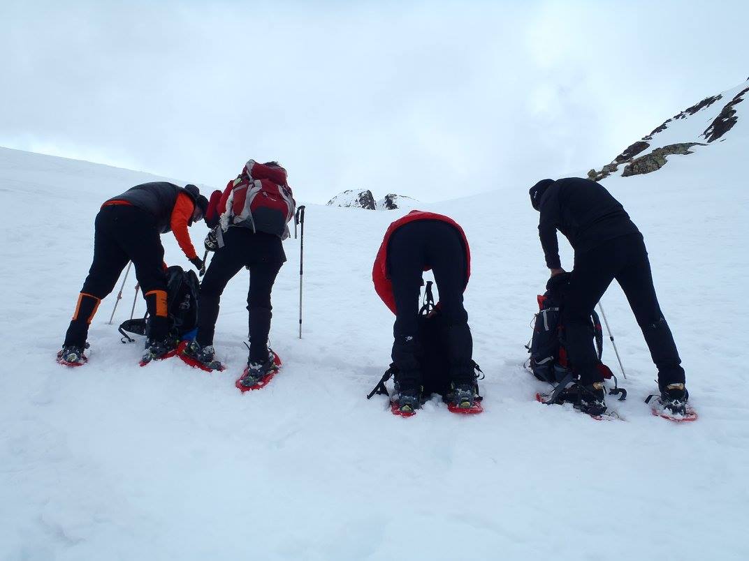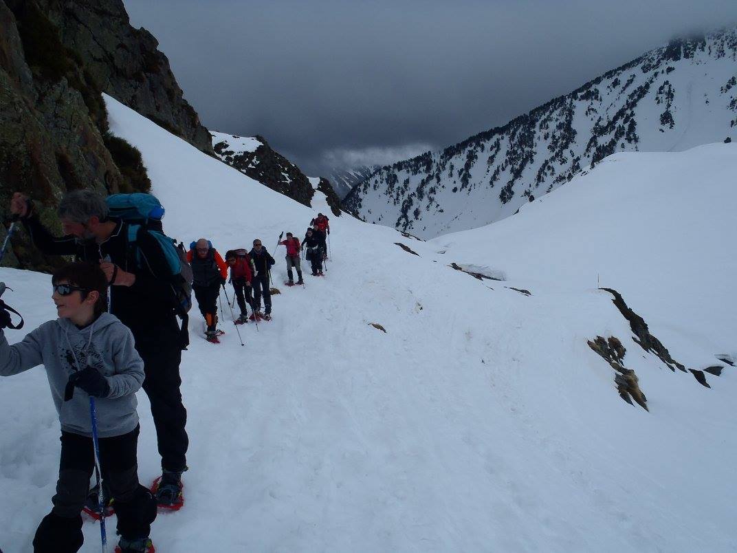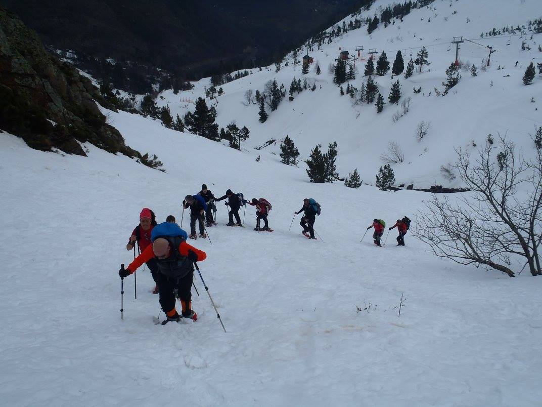 En fila india es la millor manera d’evolucionar amb rapidesa i seguretat amb les raquetes als peus, un grup ben disciplinat!