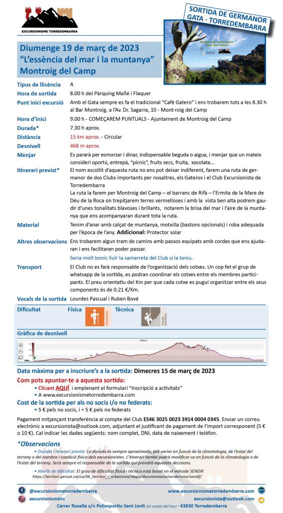 11 febrero, 202319 marzo, 2023 Excursionisme Torredembarra (19/03/2023) «L’essència del mar i la muntanya» Montroig del Camp Comparte esto: Haz clic para compartir en X (Se abre en una ventana nueva) X Haz clic para compartir en Facebook (Se abre en una ventana nueva) Facebook Me gusta Cargando...