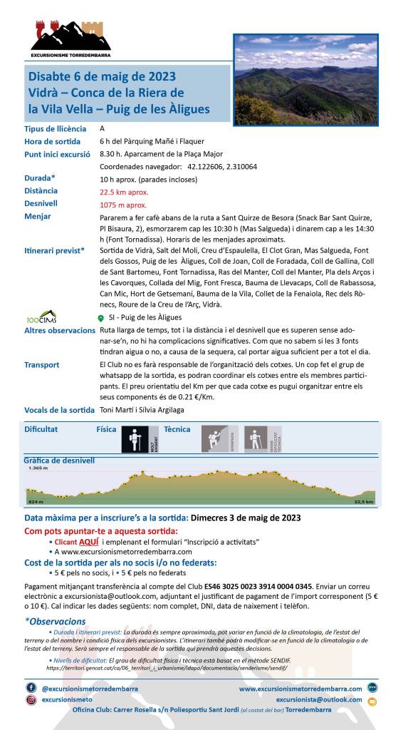 11 abril, 20237 mayo, 2023 Excursionisme Torredembarra (06/05/2023) Vidrà – Conca de la Riera de la Vila Vella – Puig de les Àligues Comparte esto: Compartir en X (Se abre en una ventana nueva) X Comparte en Facebook (Se abre en una ventana nueva) Facebook Me gusta Cargando...