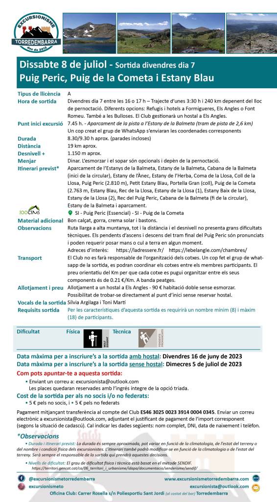 20 mayo, 202310 julio, 2023 Excursionisme Torredembarra (08/07/2023) Puig Peric, Puig de la cometa i Estany Blau Comparte esto: Compartir en X (Se abre en una ventana nueva) X Comparte en Facebook (Se abre en una ventana nueva) Facebook Me gusta Cargando...