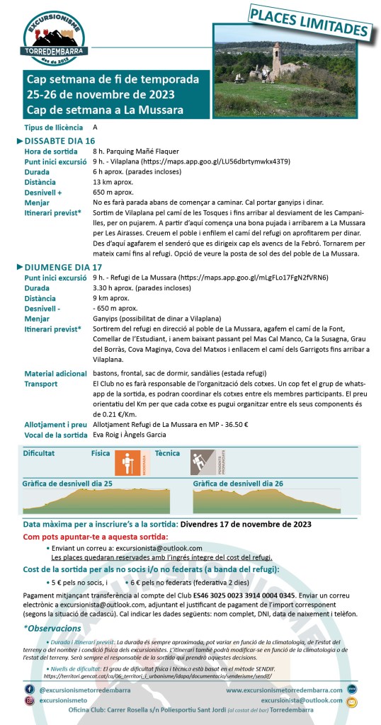8 noviembre, 202311 diciembre, 2023 Excursionisme Torredembarra (25-26/11/2023) Cap de setmana a la Musara Comparte esto: Haz clic para compartir en X (Se abre en una ventana nueva) X Haz clic para compartir en Facebook (Se abre en una ventana nueva) Facebook Me gusta Cargando...