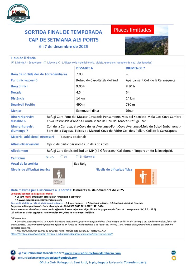 1 junio, 202515 diciembre, 2025 Excursionisme Torredembarra (06 i 07/12/2025) Sortida final de temporada. Cap de setmana als Ports. Comparte esto: Compartir en X (Se abre en una ventana nueva) X Comparte en Facebook (Se abre en una ventana nueva) Facebook Me gusta Cargando...